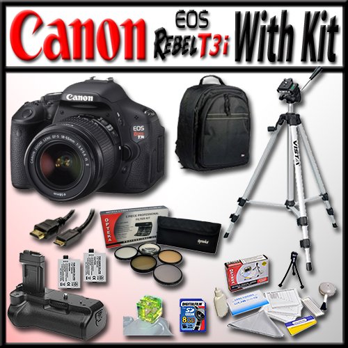 - Package includes: Canon EOS Rebel T3i 18 MP CMOS Digital SLR, Canon EF-S 18-55mm f/3.5-5.6 IS, Professional Travel Backpack, 8Gb SD Memory card, 2 Extra LP-E8 Extended Life High Capacity Batteries with Opteka Power Grip, Travel Tripod, Triple Axis Bubble Level, 5 Piece HD2 Filter kit, Mini HDMI to HDMI Cable and a 5 Piece cleaning kit